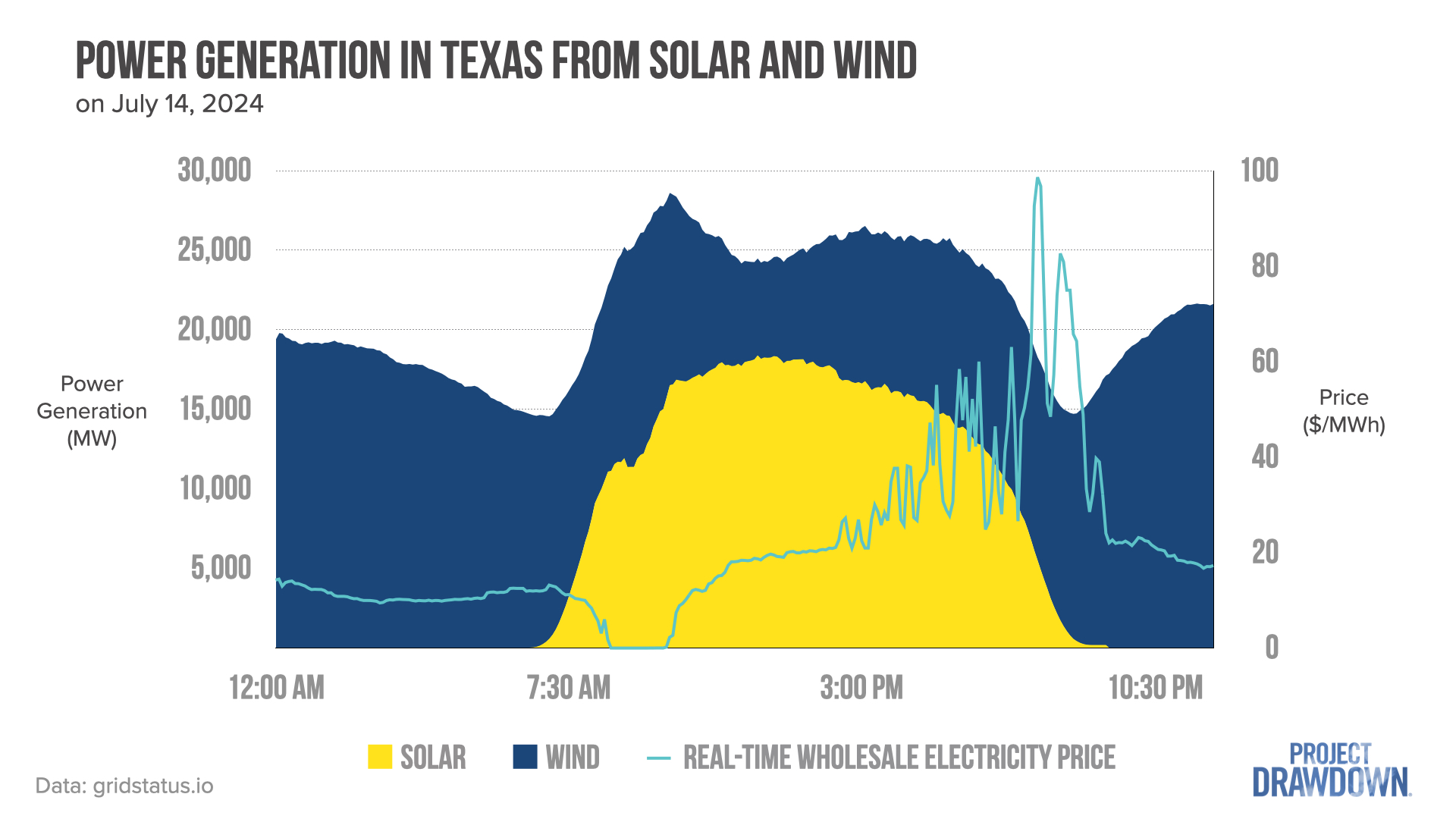 Figure 1. Power generation from solar PV and wind with real-time wholesale electricity price in Texas on July 14, 2024.