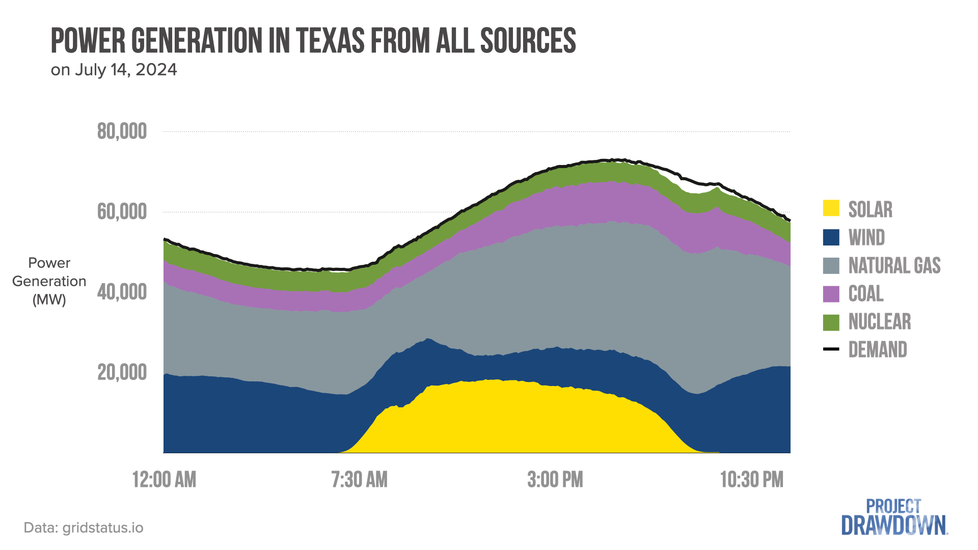 Figure 2. Power generation from – almost – all sources with real-time electricity demand in Texas on July 14, 2024.